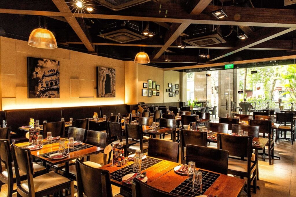 Publico Ristorante at Clarke Quay offers riverside dining for lovely nights out. Their indoor long tables accommodate large groups, plus their contemporary Italian interior welcomes diners with an inviting atmosphere.