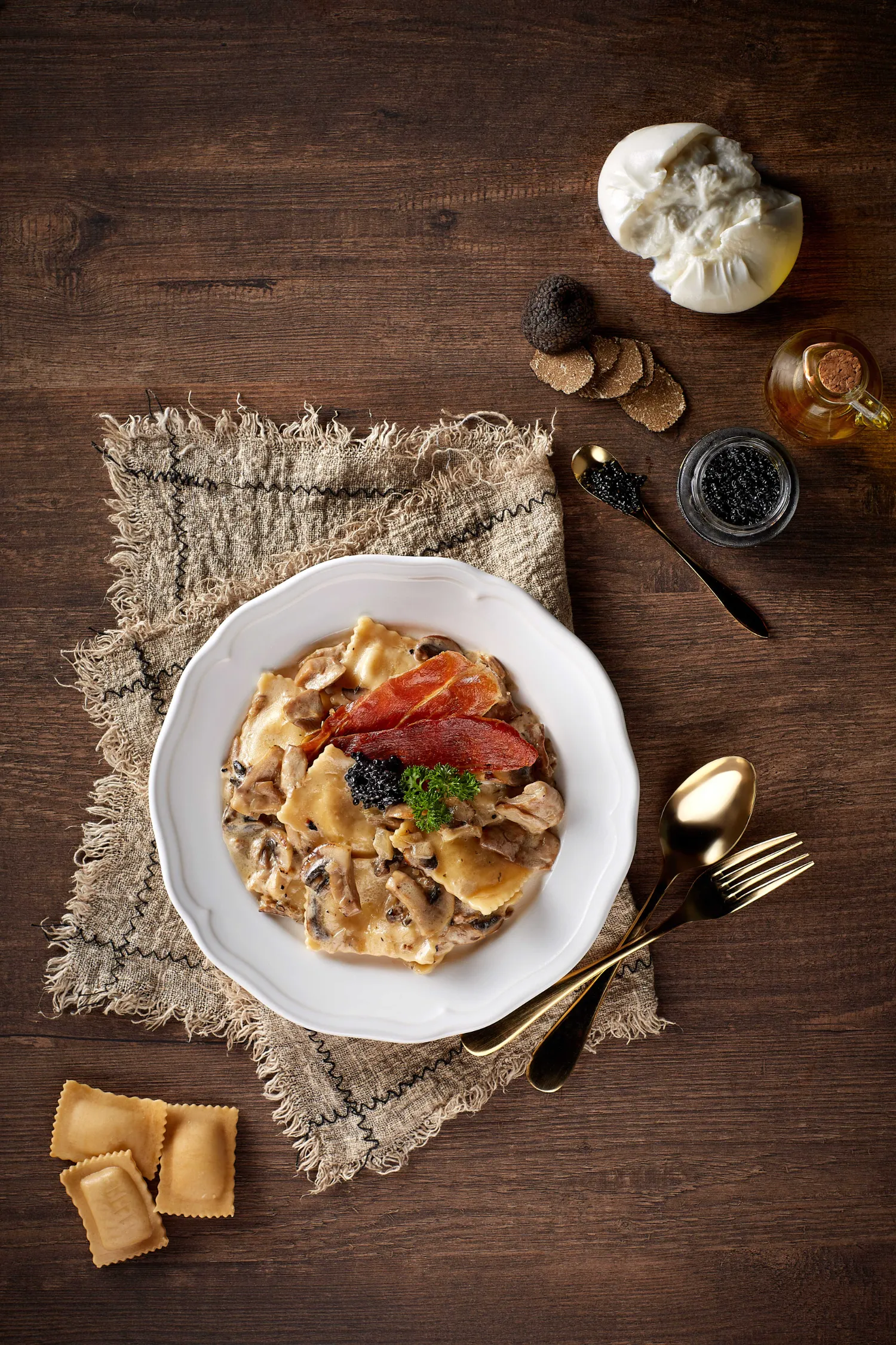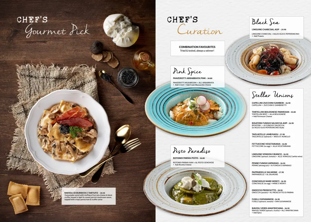 One of our chef’s gourmet picks is a rotondi stuffed with parma ham, tossed in al pesto genovese, then topped with ricotta cheese. Though not a traditional pasta dish, our creative interpretation made for a luscious yet herbal, rich, savoury taste. After all, that’s what culinary artistry is all about.